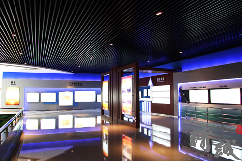 臨汾·甘亭新型工業(yè)園區(qū)規(guī)劃展覽館的展廳運(yùn)用藍(lán)色作為展廳環(huán)境色,體現(xiàn)新型工業(yè)園區(qū)的科技感。具有生命力的波浪狀向上推進(jìn)企業(yè)形象墻,沙盤頂部的概念性吊頂裝飾,和黑色鏡面點(diǎn)綴的展墻,營造了良好的視覺效果,同時(shí)也體現(xiàn)了園區(qū)飛速發(fā)展的美好愿景。