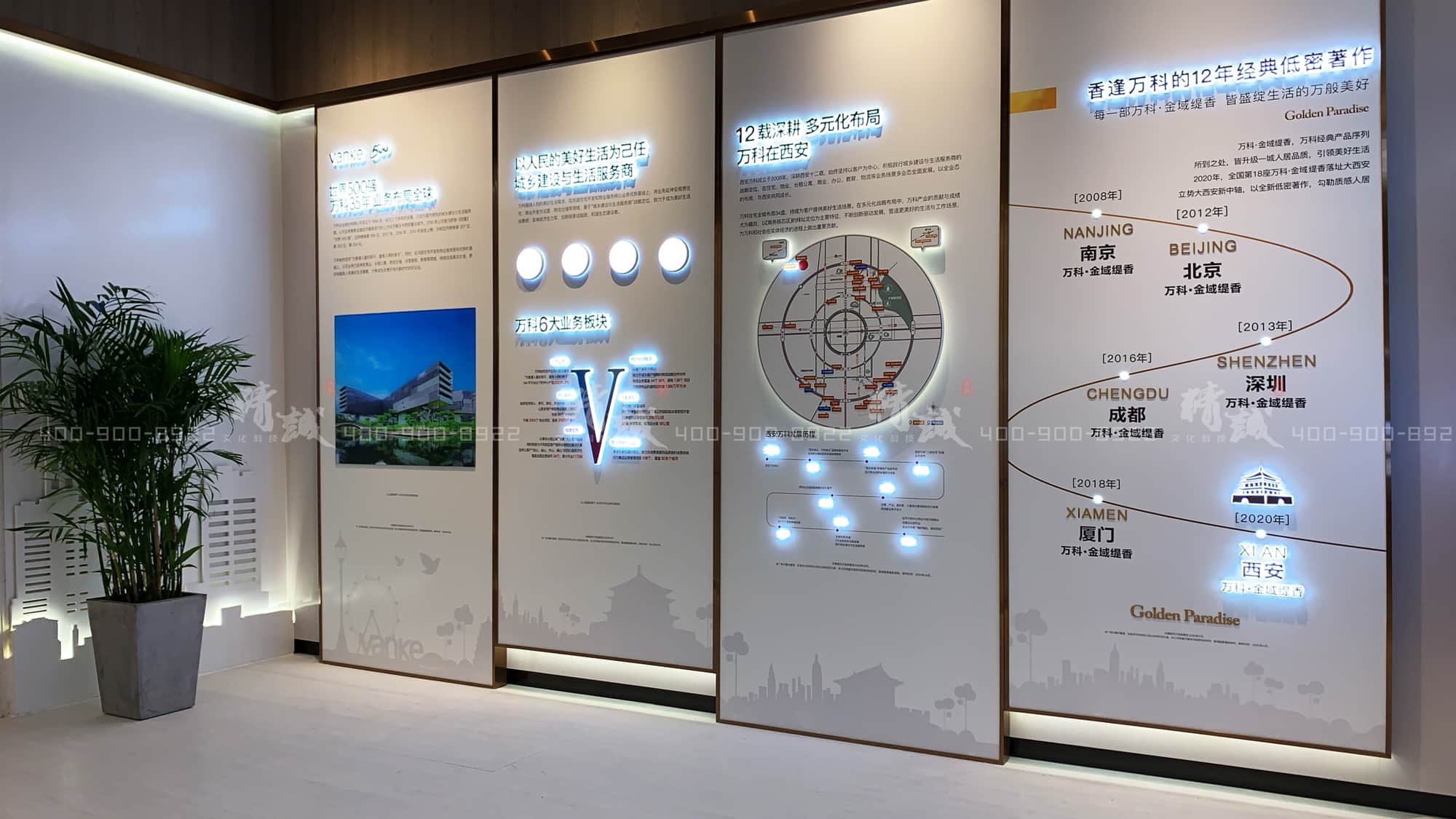 十二載深耕布局,十二年經(jīng)典著作,墻面的四幅展板記錄著萬科在西安發(fā)展的每一個歷程。