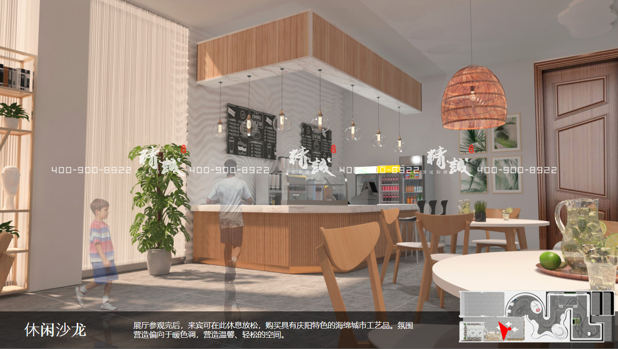 規(guī)劃館參觀完后,來賓可在此休息放松,購(gòu)買具有慶陽(yáng)特色的海綿城市工藝品。氛圍營(yíng)造偏向于暖色調(diào),營(yíng)造溫馨、輕松的空間。