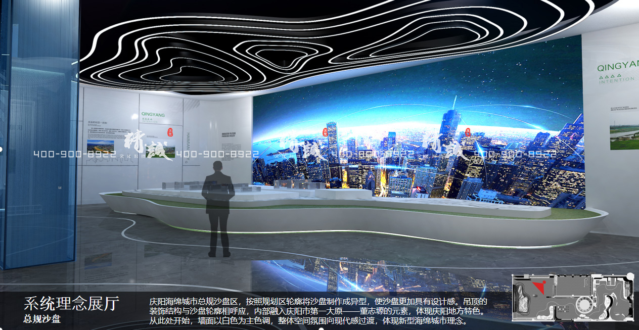 慶陽(yáng)海綿城市總規(guī)沙盤區(qū),按照規(guī)劃區(qū)輪廓將沙盤制作成異型,使沙盤更加具有設(shè)計(jì)感。吊頂?shù)难b飾結(jié)構(gòu)與沙盤輪廓相呼應(yīng),內(nèi)部融入慶陽(yáng)市第一大原——董志塬的元素,體現(xiàn)慶陽(yáng)地方特色。從此處開始,墻面以白色為主色調(diào),整體空間氛圍向現(xiàn)代感過渡,體現(xiàn)新型海綿城市理念。