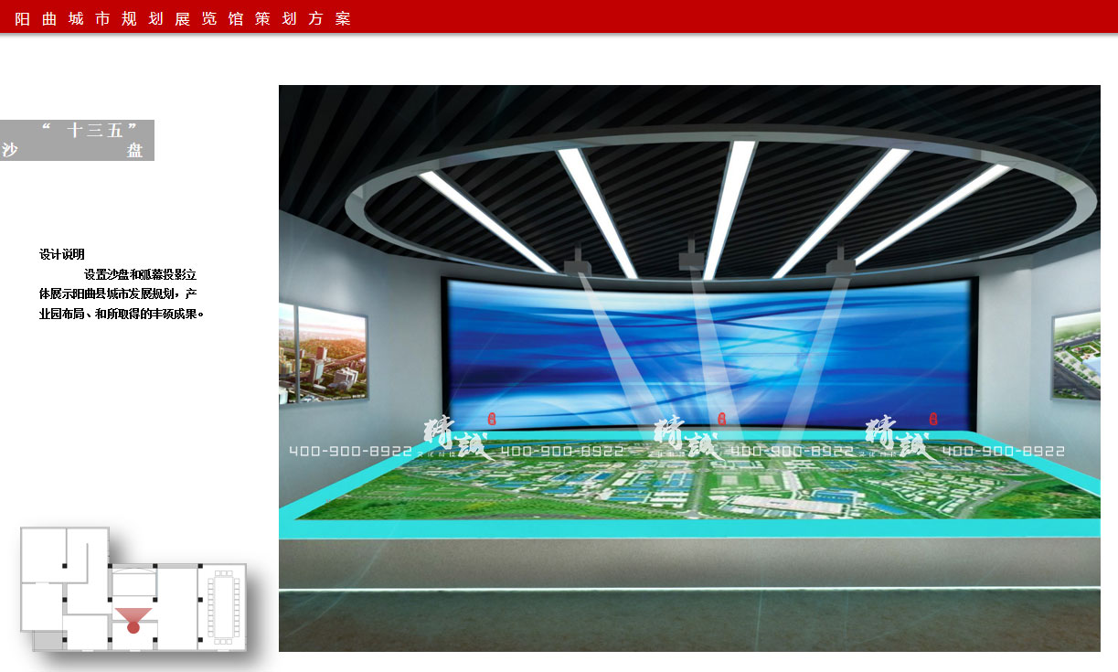 設置沙盤和弧幕投影立體展示陽曲縣城市發(fā)展規(guī)劃,產業(yè)園布局、和所取得的豐碩成果。
