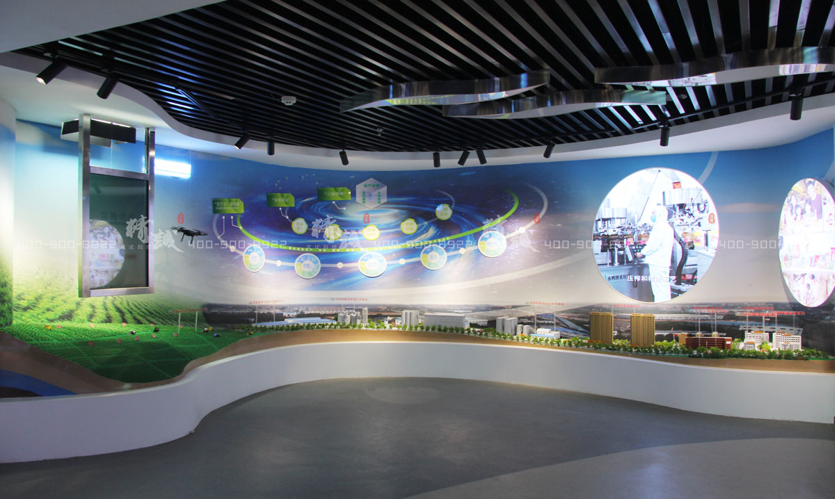 增加觀者的互動參與感。場景體驗區(qū),設(shè)置五大體驗板塊,分別以透明液晶屏,AR,實景沙盤等多媒體技術(shù),展現(xiàn)糧農(nóng)集團從生產(chǎn)到物流倉儲及質(zhì)量把控等環(huán)節(jié)的技術(shù)詳細呈現(xiàn)。
