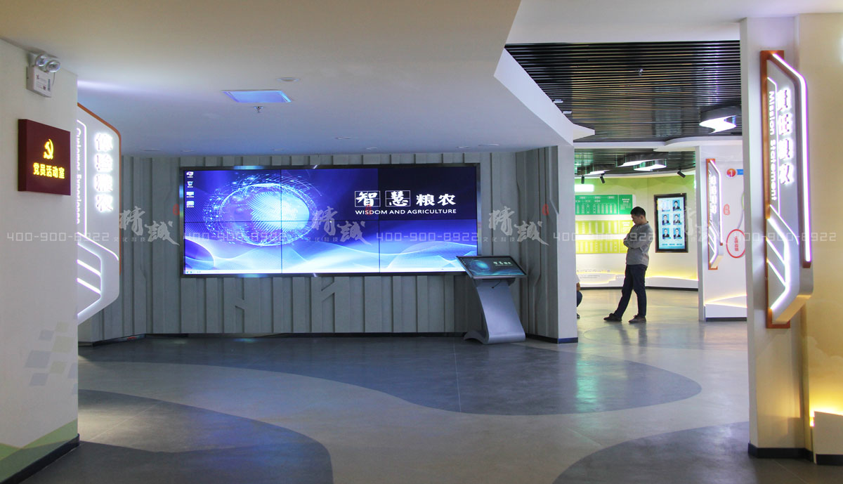 采用液晶顯示屏打造一面榮譽墻,展現(xiàn)員工之星、企業(yè)之星、產(chǎn)業(yè)之星等內(nèi)容。格柵造型隔斷,展現(xiàn)糧農(nóng)之歌,有效隔開空間并考慮展廳的視覺通透性。