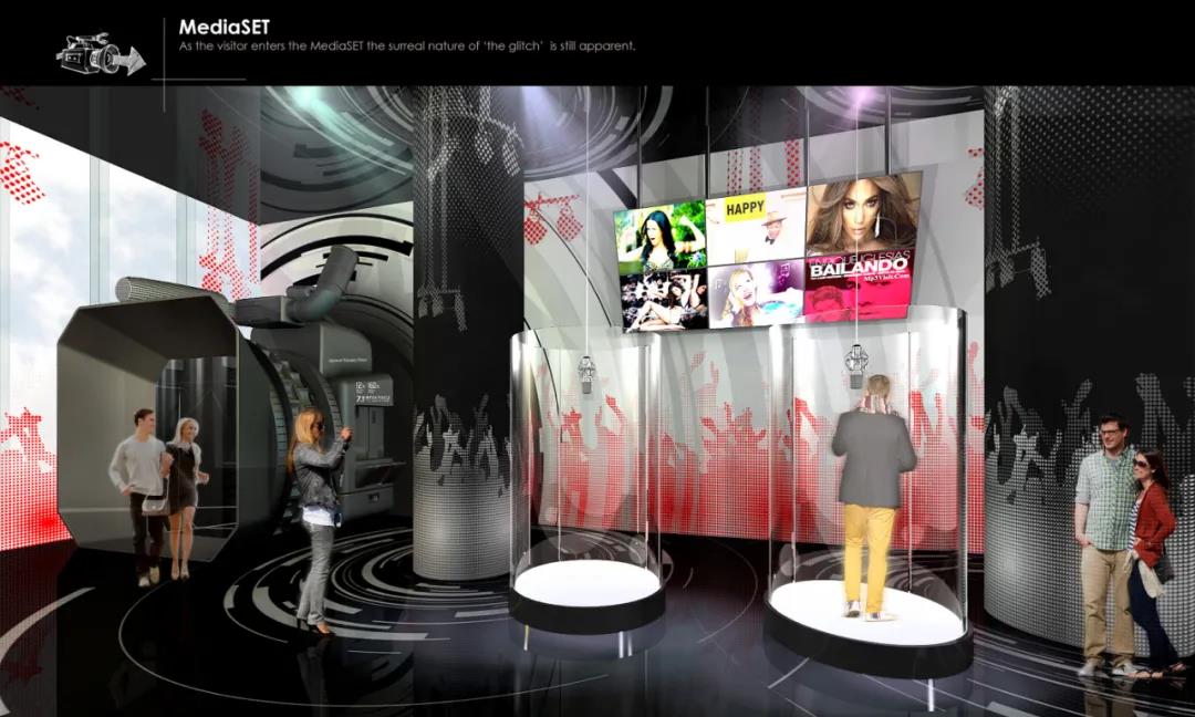 媒體矩陣:當參觀者走過屏幕時,他們會發(fā)現(xiàn)自己置身于一臺舊電視里,他們將會被抽象的電子部件所構成的豐富環(huán)境所震撼。