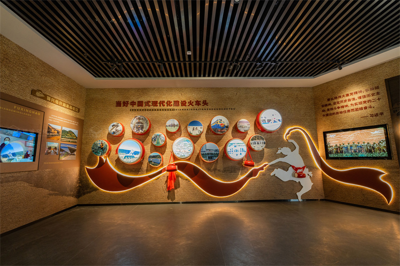 展示標(biāo)題上,采用當(dāng)?shù)亓鱾鞯蔫F路民謠進(jìn)行編織,將其劃分成“筑路?中央和咱心連心”“圓夢(mèng)?火車(chē)開(kāi)到寶塔山”“發(fā)展?坐上火車(chē)逛北京”“騰飛?巨龍馳騁譜新篇”四大版塊,以全方位展現(xiàn)陜北鐵路從規(guī)劃、建設(shè)到發(fā)展壯大的歷史進(jìn)程,進(jìn)而生動(dòng)反映陜北鐵路取得的突出成就及對(duì)陜北革命老區(qū)經(jīng)濟(jì)社會(huì)發(fā)展的推動(dòng)作用。