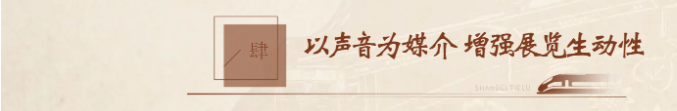 策展團(tuán)隊(duì)通過(guò)對(duì)當(dāng)?shù)孛袼孜幕难芯浚槍?duì)每一展廳的主題和內(nèi)容,特別定制了不同的音效,著重選取了陜北民歌中的嗩吶、絞煤號(hào)子、趕牲靈、安塞腰鼓等音樂(lè),以進(jìn)一步增強(qiáng)展覽的生動(dòng)性,帶給參觀者全方位的視聽(tīng)感受。