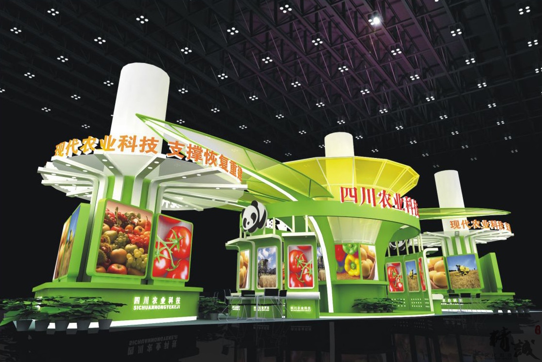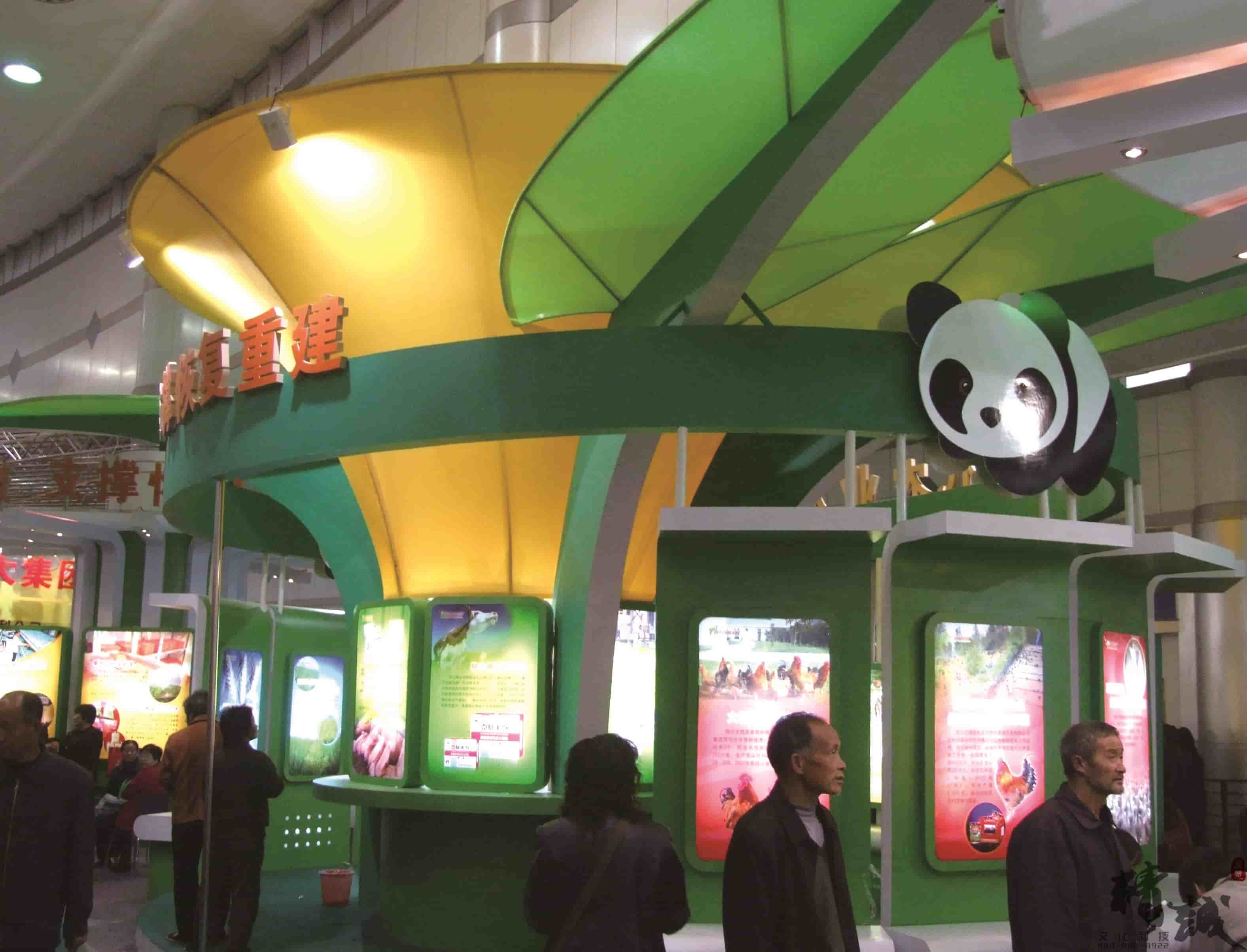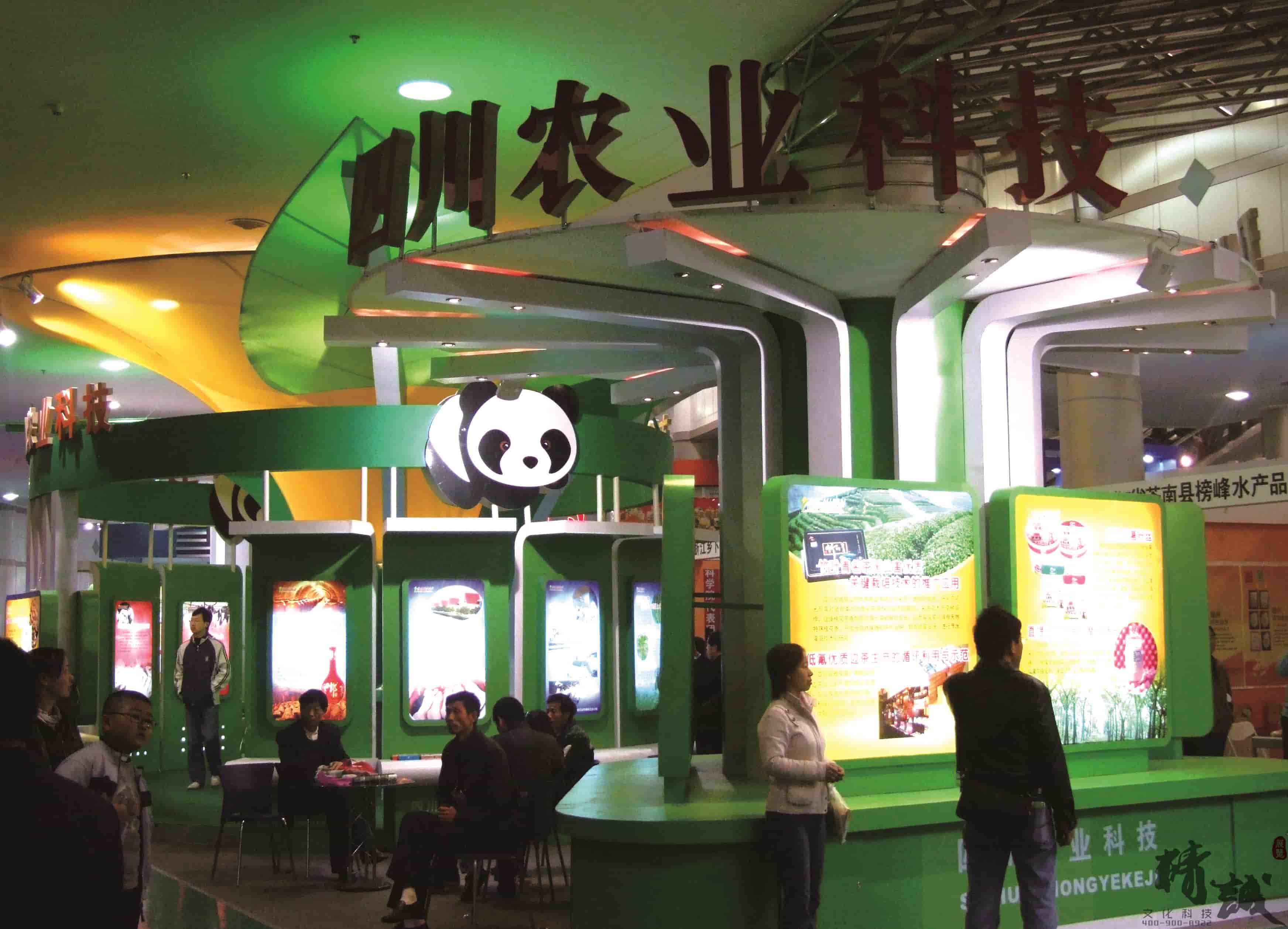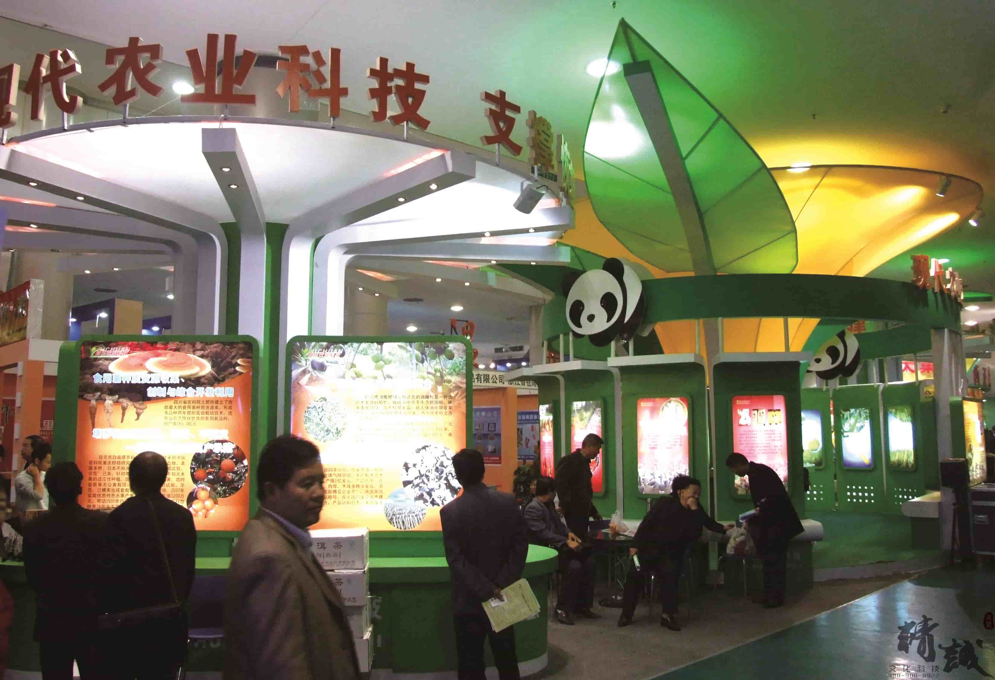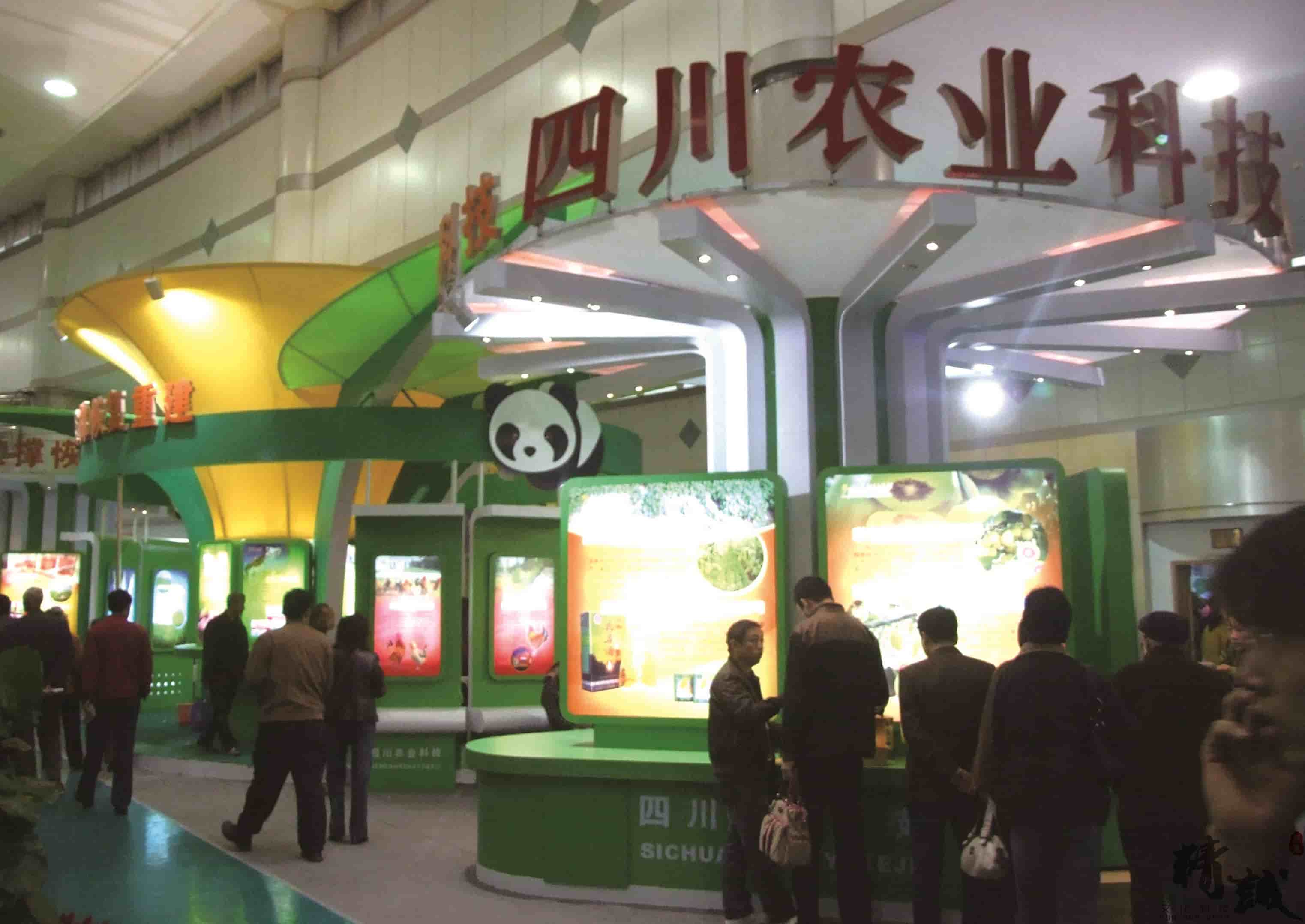 展位設計以綠色為主色,體現(xiàn)出四川綠色生態(tài)的現(xiàn)代農業(yè);恰當?shù)恼古_設計,便于特色產品的展示;“國寶”熊貓雕刻畫裝飾,使得展位賦予了活潑與動態(tài)感。整個展位突顯了四川的綠色、生態(tài)。