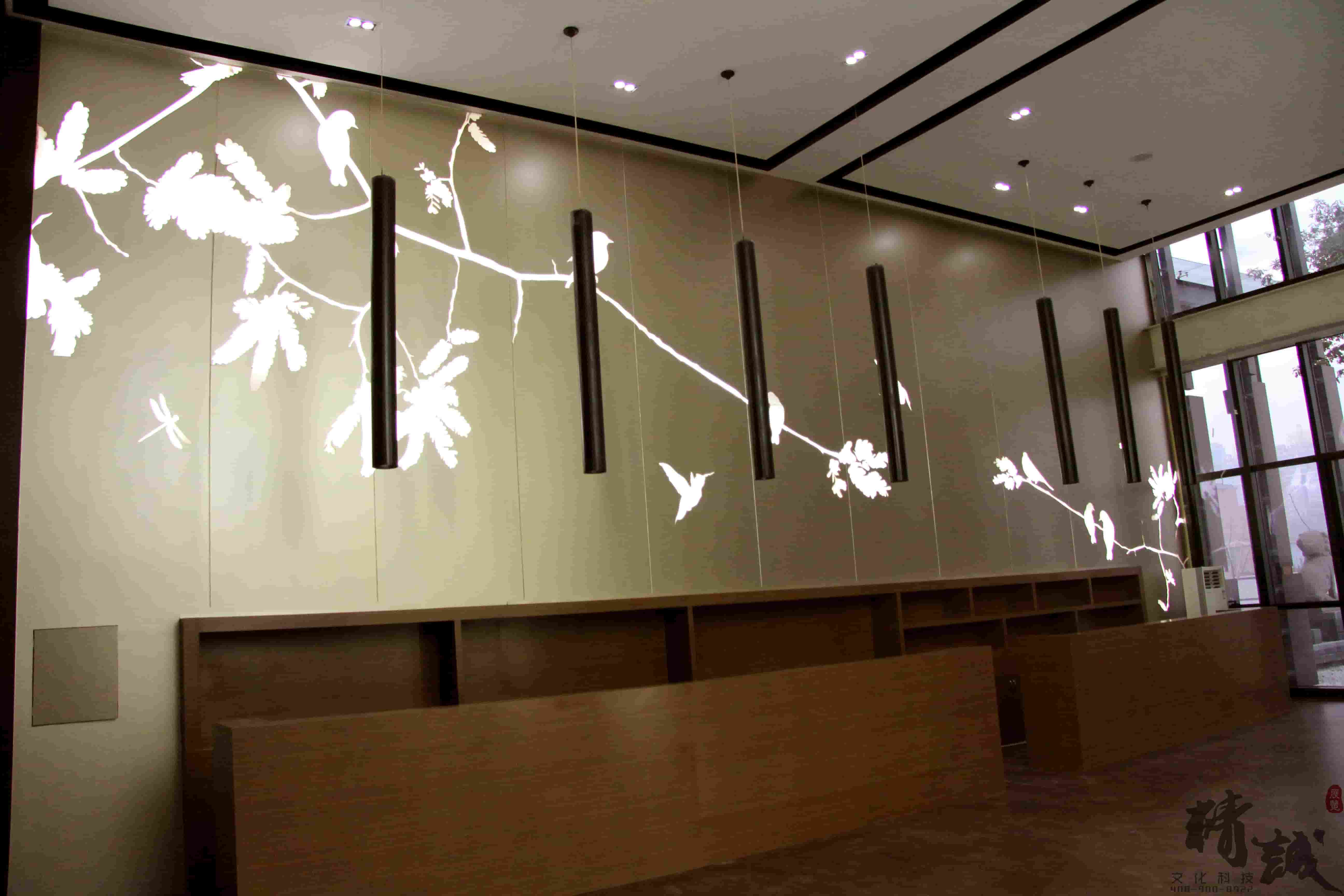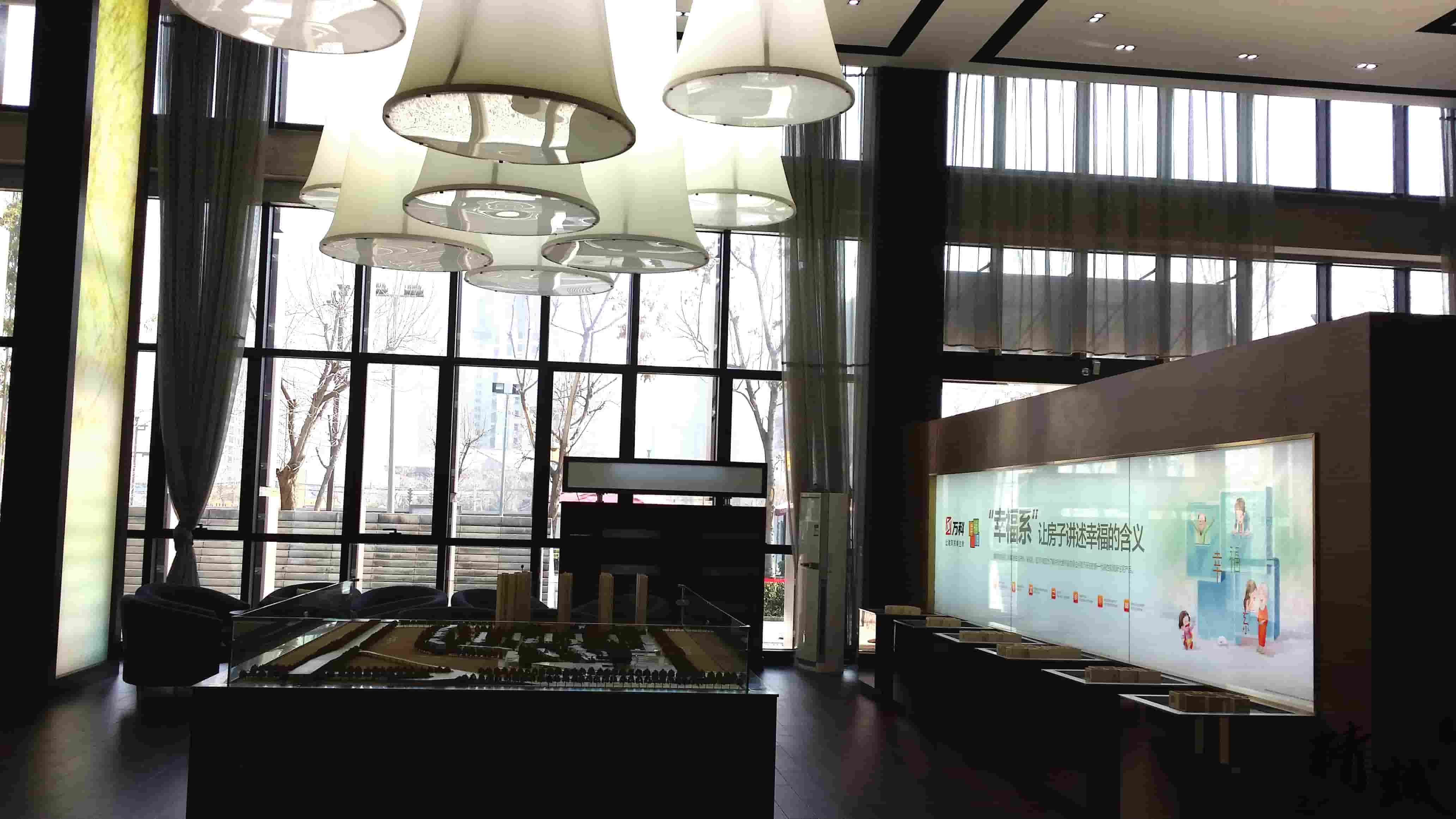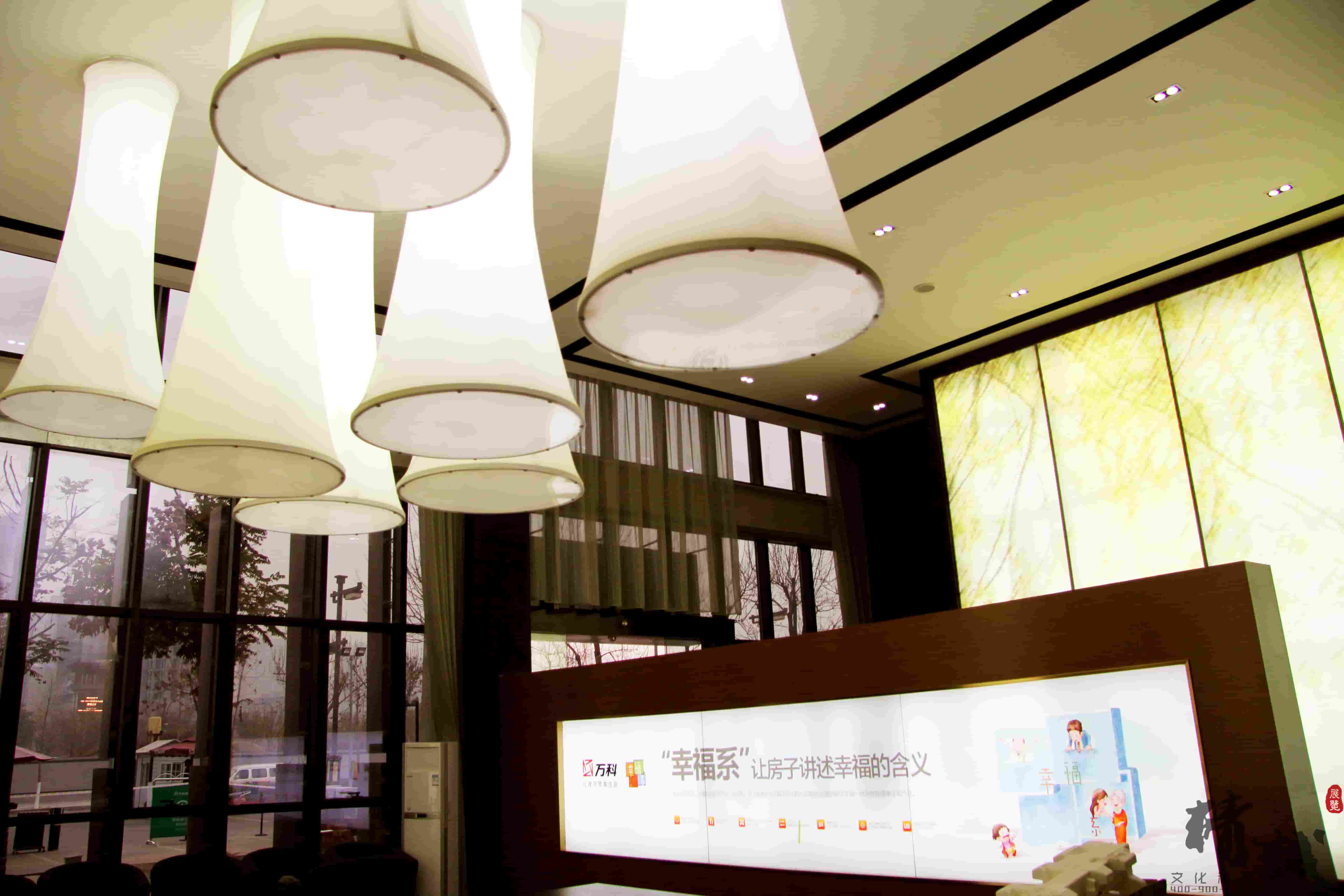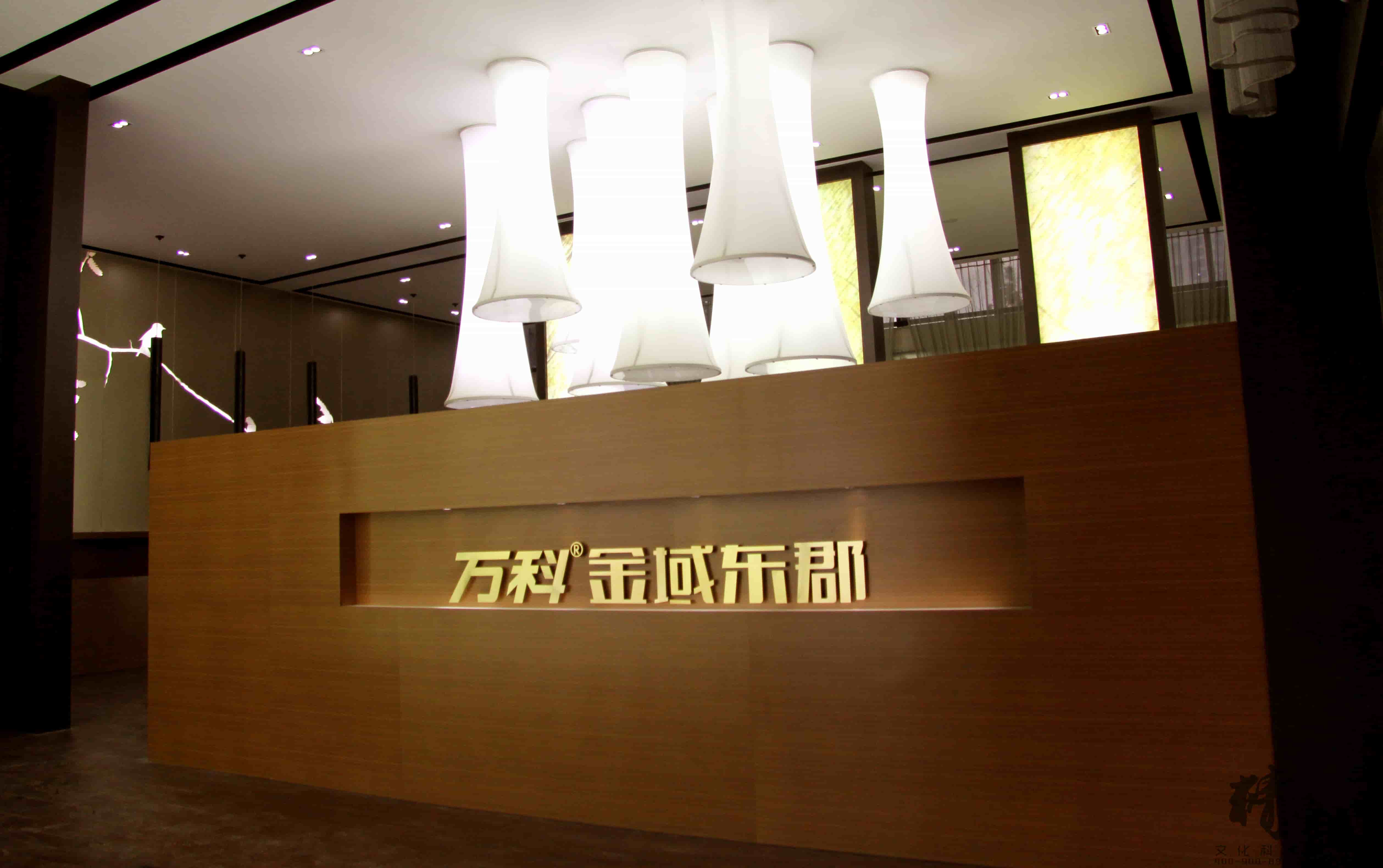 對(duì)于萬(wàn)科金域東郡的裝飾裝修設(shè)計(jì)整個(gè)展廳色調(diào)以穩(wěn)重的棕色為主,用適當(dāng)?shù)慕鹕鳛辄c(diǎn)綴,顯得整個(gè)展廳高端、大氣。大廳頂部懸掛的創(chuàng)意燈飾和墻面花語(yǔ)林鳥(niǎo)的燈光修飾,則為展廳帶來(lái)一絲清幽的新意,猶如清風(fēng)拂面。